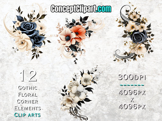 12 x Gothic Floral Corner Elements Clipart Bundle